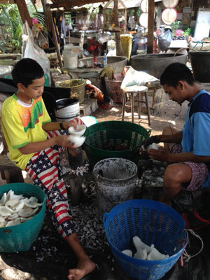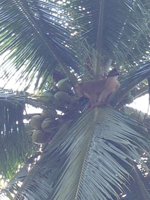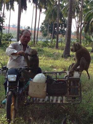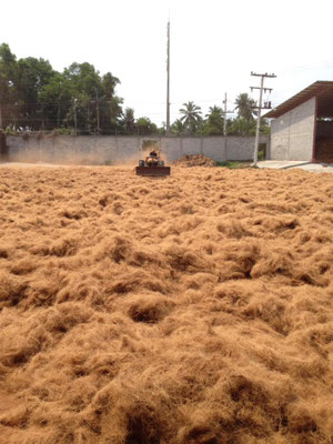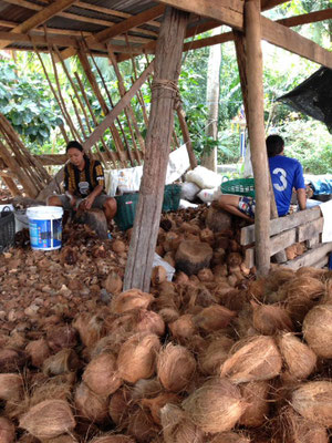 visitons tout d’abord une fabrique de fibre de noix, fibre notamment utilisée pour confectionner les lits puis nous assistons au travail des singes dressés et à la cueillette des noix de coco. La